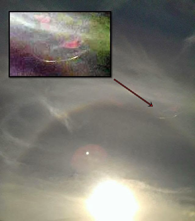 Witness Statement: I notice a large number of con-trails that afternoon. I went outside and took two images of the sky which included the Sun. I had no idea there was anything different on one of the images.